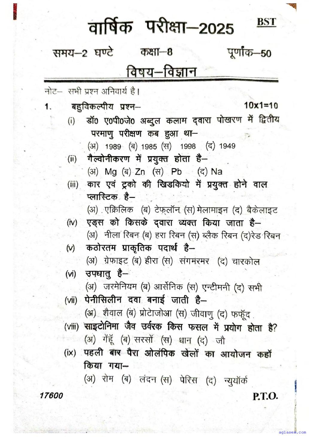UP Board Class 8 Science Question Paper 2026 is published after exam. You can download the UP Board Class 8 Science Previous Year Question Paper PDF from here on aglasem to practice for your upcoming paper. It contains actual questions asked in the past year Science exam. This UP Board Class 8 Question Paper is for the Science subject and helps you understand exam difficulty level, types of questions to expect in exams. Therefore by practising the Science question paper, you can improve your preparation for the 8th standard exams and aim to score full marks in Science.