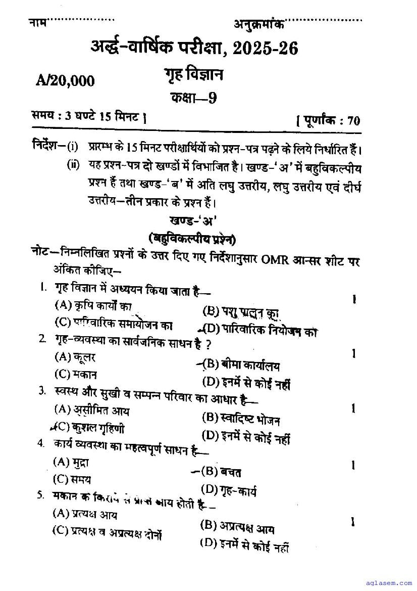 UP Board Class 9 Home Science Half-Yearly Question Paper 2026 is published here after mid exam. You can download the UP Board Class 9 Home Science Previous Year Half Yearly Question Paper PDF from here on aglasem to practice for your upcoming paper. It contains actual questions asked in the past year half yearly Home Science exam. This UP Board Class 9 Question Paper for Half yearly examination is for the Home Science subject and helps you understand exam difficulty level, types of questions to expect in exams. Therefore by practicing the Home Science half yearly exam question paper, you can improve your preparation for the 9th standard exams and aim to score full marks in Home Science.