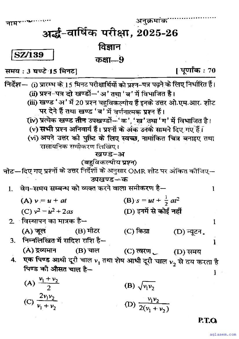 UP Board Class 9 Science Half-Yearly Question Paper 2026 is published here after mid exam. You can download the UP Board Class 9 Science Previous Year Half Yearly Question Paper PDF from here on aglasem to practice for your upcoming paper. It contains actual questions asked in the past year half yearly Science exam. This UP Board Class 9 Question Paper for Half yearly examination is for the Science subject and helps you understand exam difficulty level, types of questions to expect in exams. Therefore by practicing the Science half yearly exam question paper, you can improve your preparation for the 9th standard exams and aim to score full marks in Science.