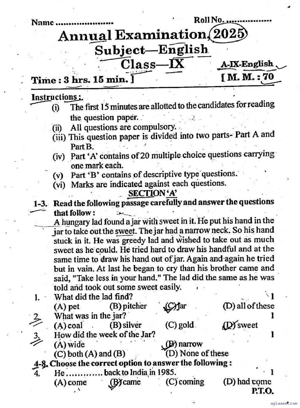 UP Board Class 9 English Question Paper 2026 is published after exam. You can download the UP Board Class 9 English Previous Year Question Paper PDF from here on aglasem to practice for your upcoming paper. It contains actual questions asked in the past year English exam. This UP Board Class 9 Question Paper is for the English subject and helps you understand exam difficulty level, types of questions to expect in exams. Therefore by practising the English question paper, you can improve your preparation for the 9th standard exams and aim to score full marks in English.