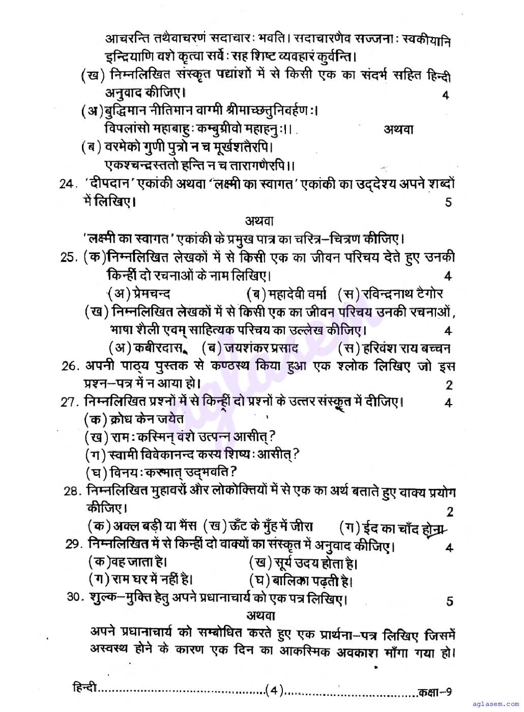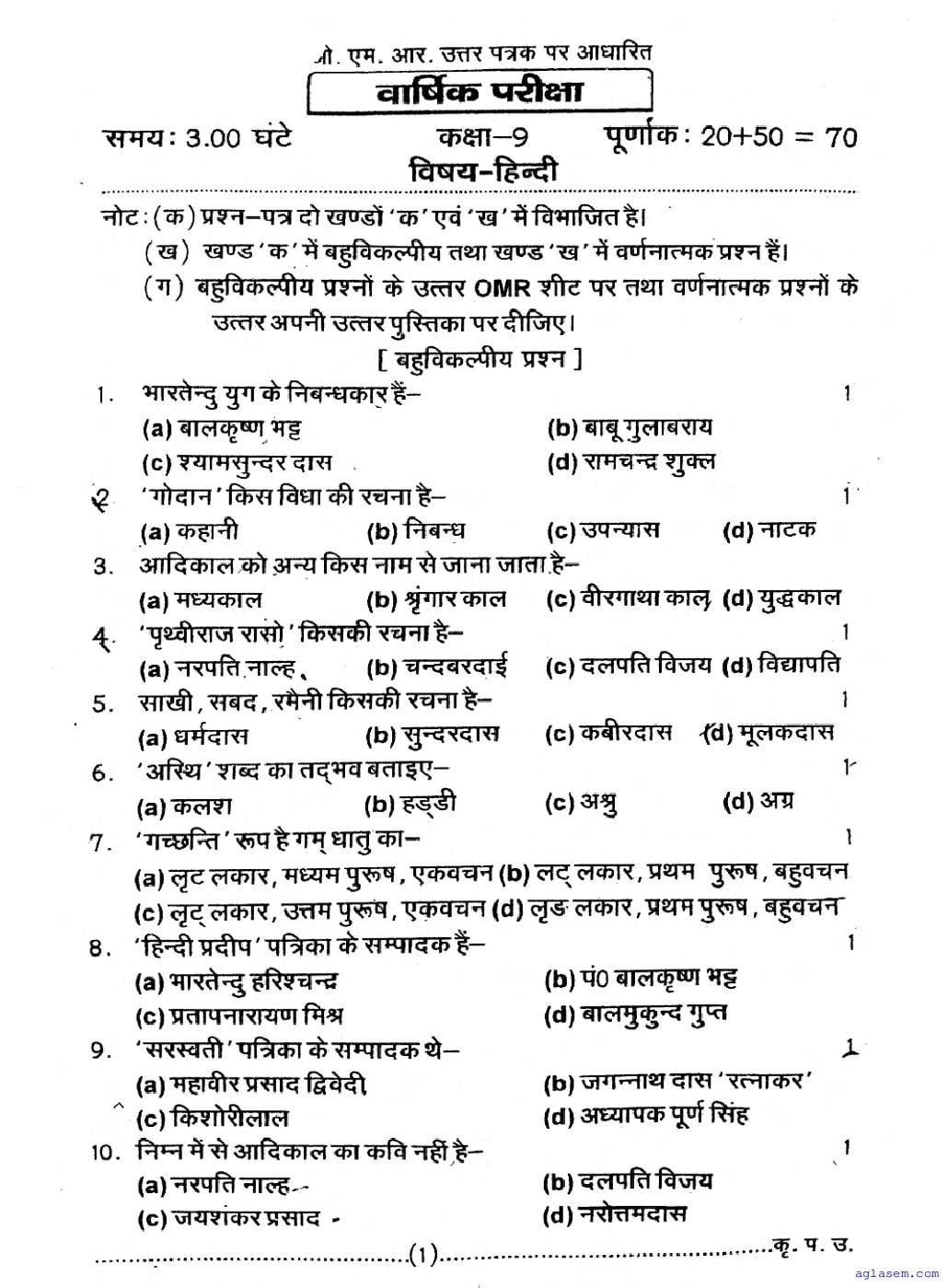 UP Board Class 9 Hindi Question Paper 2026 is published after exam. You can download the UP Board Class 9 Hindi Previous Year Question Paper PDF from here on aglasem to practice for your upcoming paper. It contains actual questions asked in the past year Hindi exam. This UP Board Class 9 Question Paper is for the Hindi subject and helps you understand exam difficulty level, types of questions to expect in exams. Therefore by practising the Hindi question paper, you can improve your preparation for the 9th standard exams and aim to score full marks in Hindi.