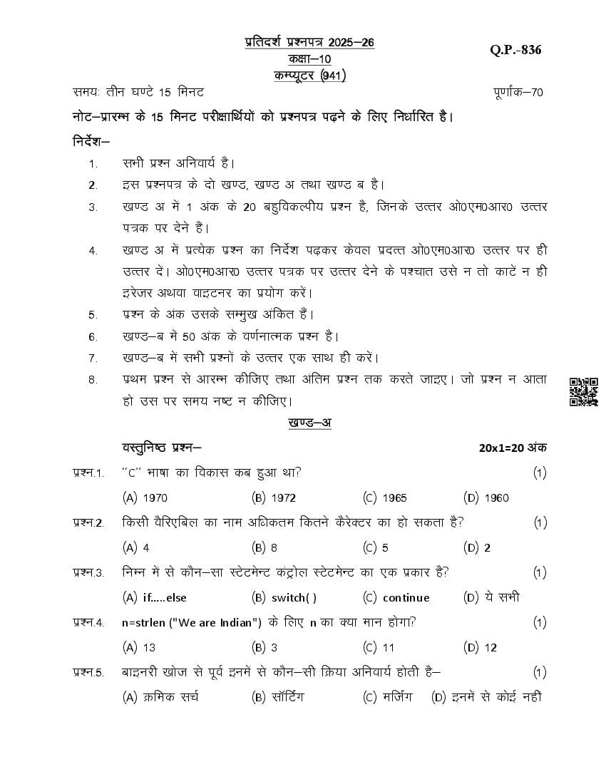 UP Board Class 10th Model Paper 2026 Computer View Download