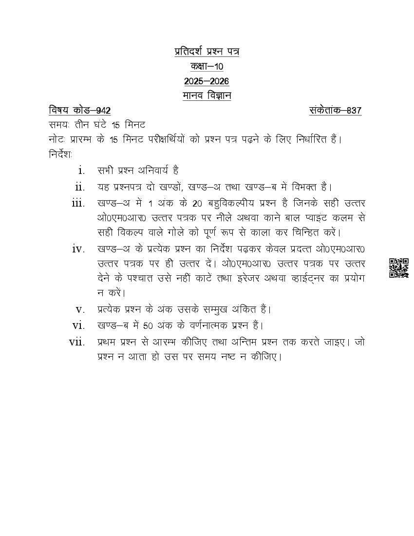 UP Board Class 10th Model Paper 2026 Human Science View Download