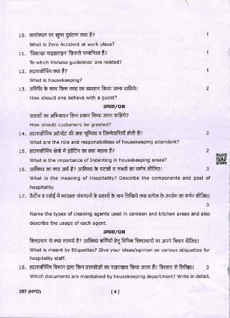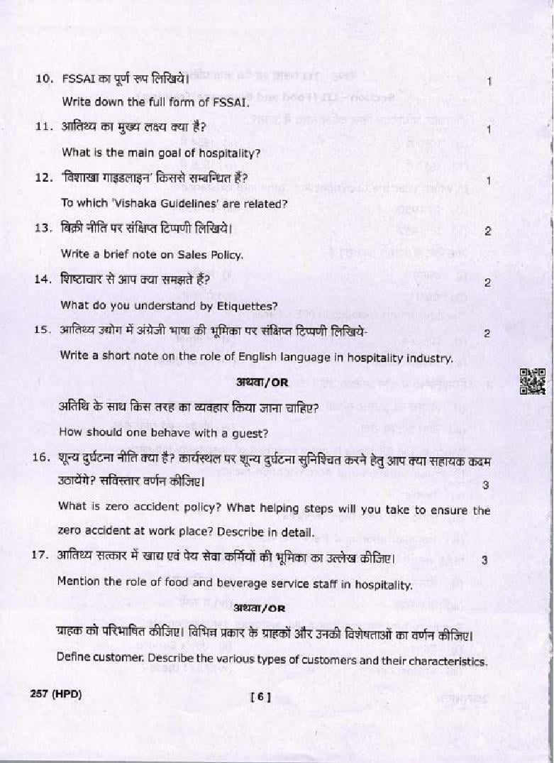 The complete class 10 Tourism and Hospitality question paper is as follows.