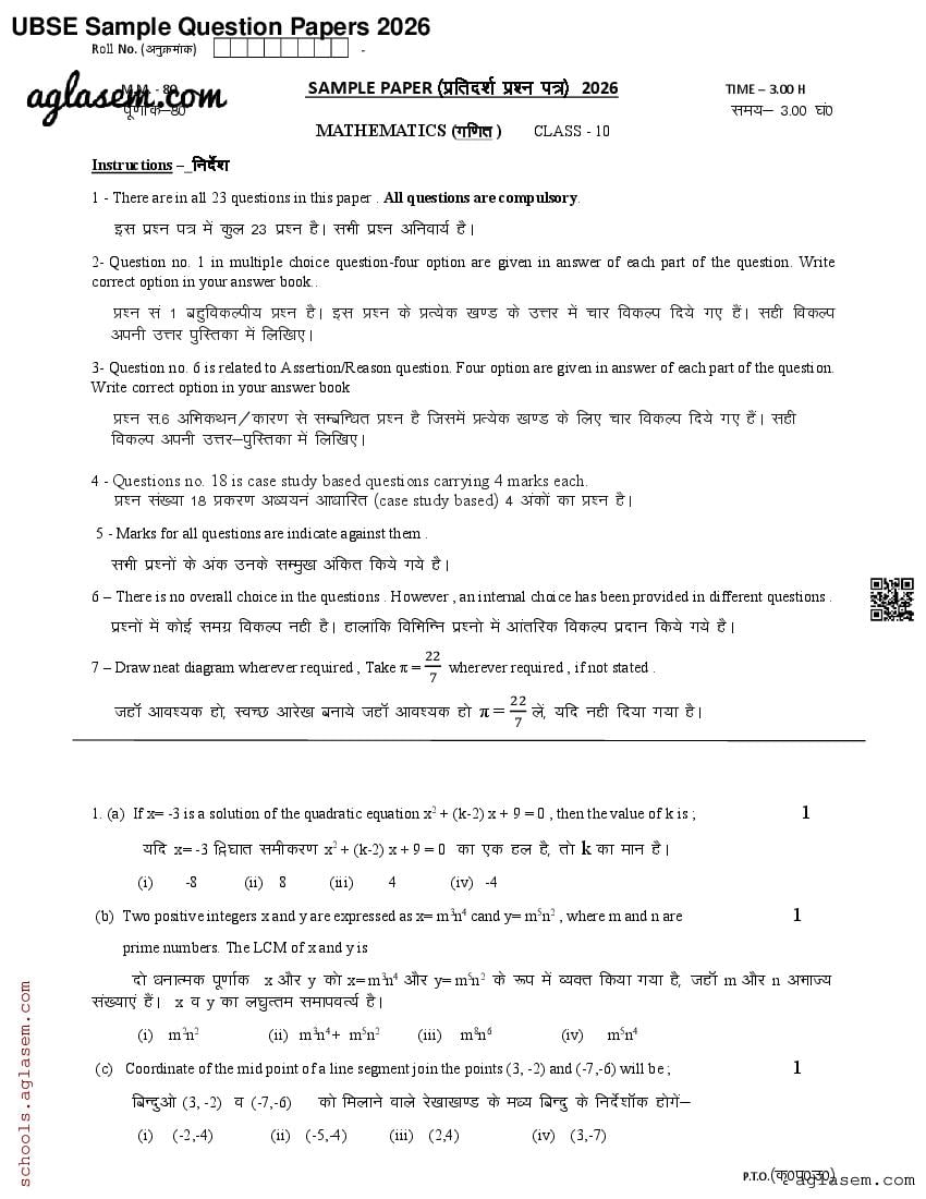 Uttarakhand Board Class 10th Maths Sample Paper 2026 has been released by UBSE. Therefore you can now download the UK Board 10th Model Paper for Maths PDF from here on aglasem. This UK Board class 10 model paper contains sample questions for Maths based on the latest syllabus. Moreover the class 10 sample paper has Maths questions in the same pattern as you will get in UK Board 10th Maths exam that will be held by Uttarakhand Board of School Education. Therefore solving this Maths model question paper increases your chances of getting 100% in UK Board exam.