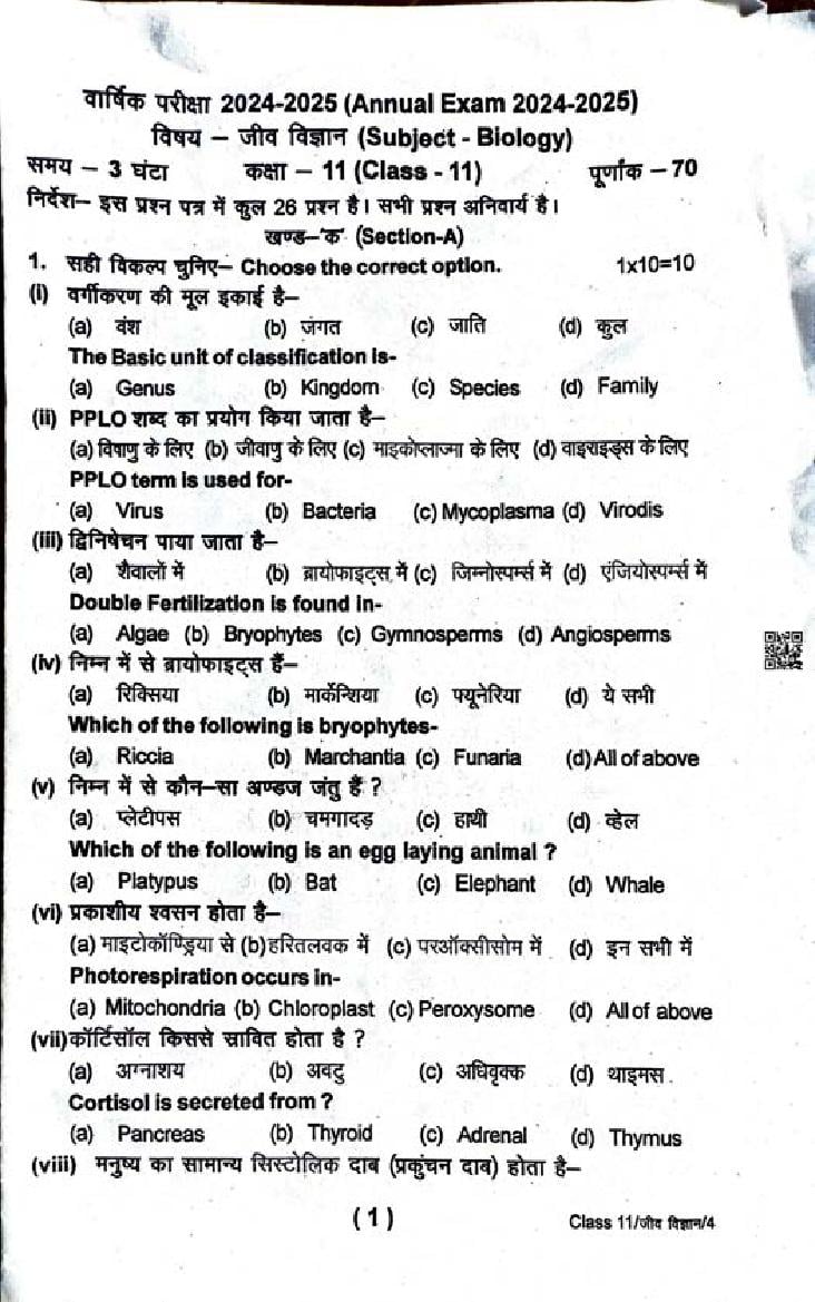 Uttarakhand Board Class 11 Biology Question Paper 2025