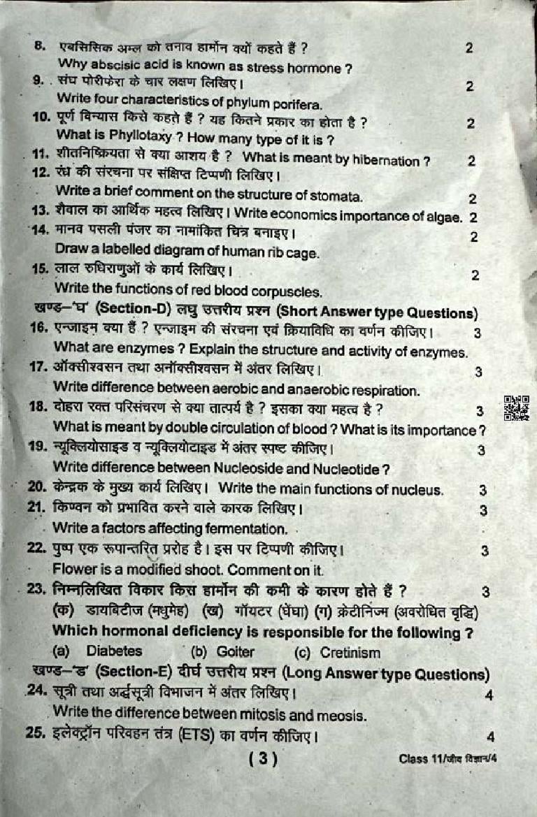 The complete class 11 Biology question paper is as follows.