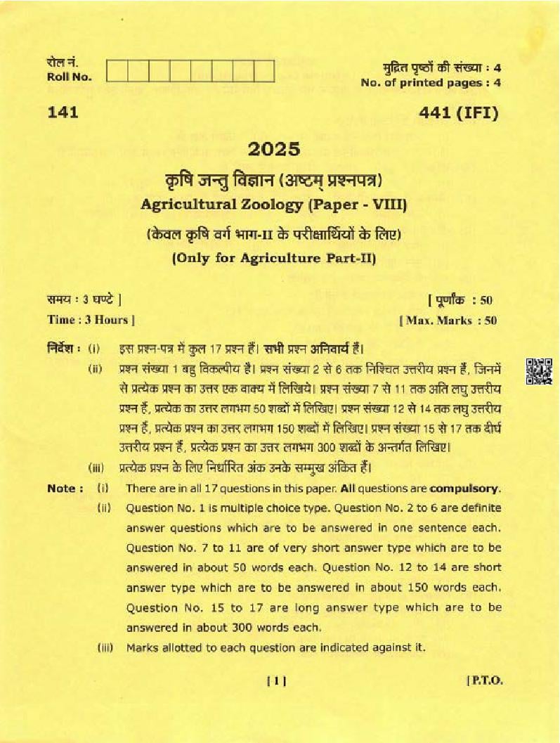 Uttarakhand Board Class 12 Question Paper 2025 For Agricultural Zoology View Download