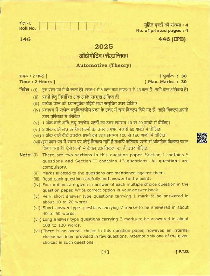 Uttarakhand Board Class 12 Question Paper 2025 For Automotive View Download