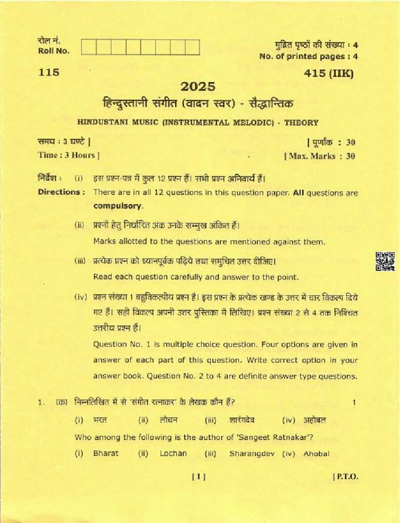 Uttarakhand Board Class 12 Question Paper 2025 For Hindusani Music View Download