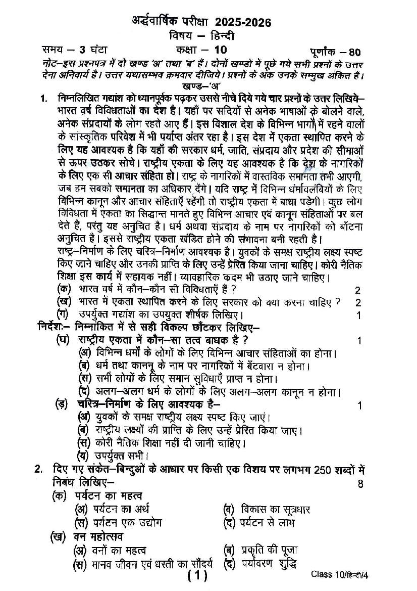 Uttarakhand Board Class 10 Hindi Half-Yearly Question Paper 2026