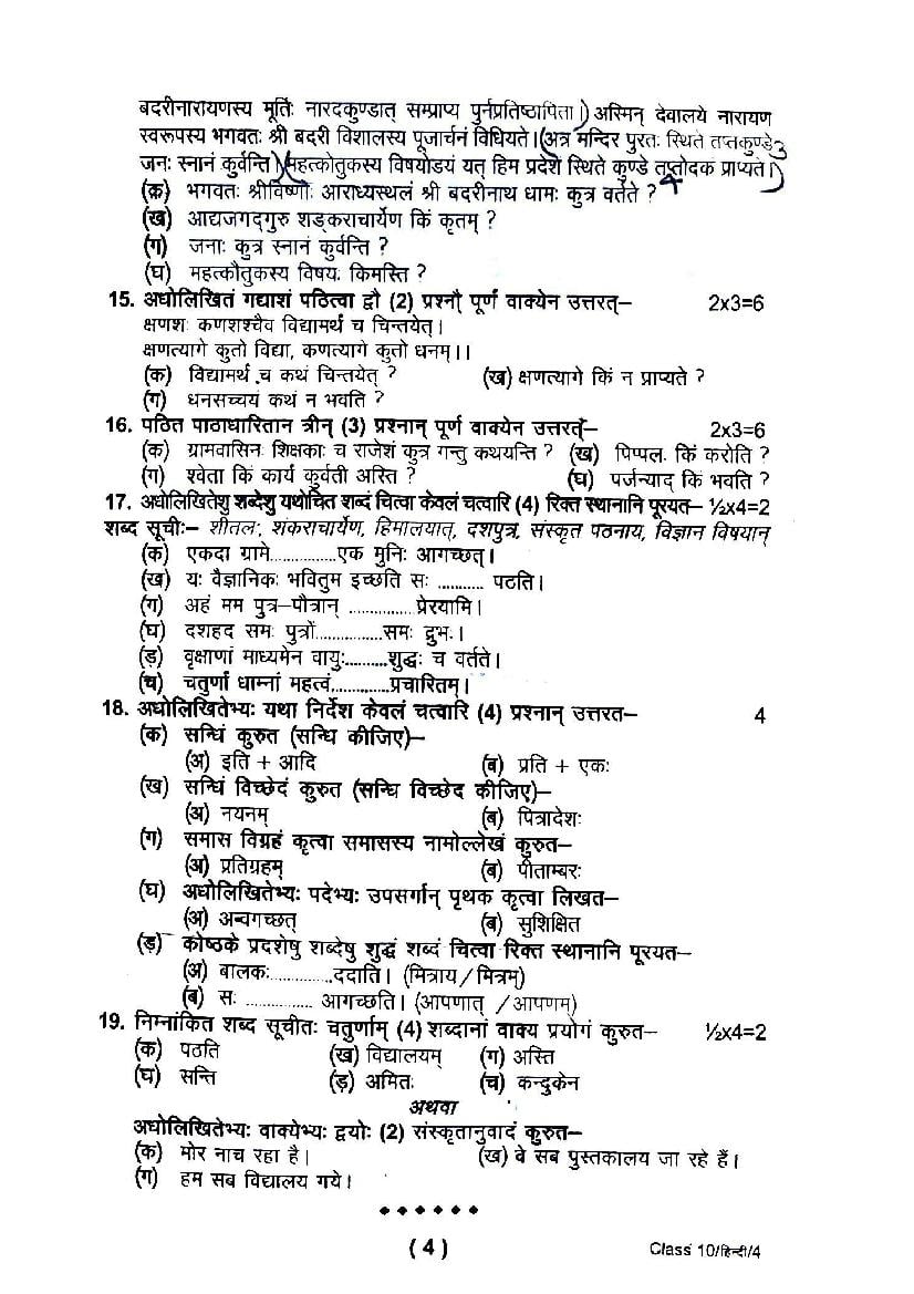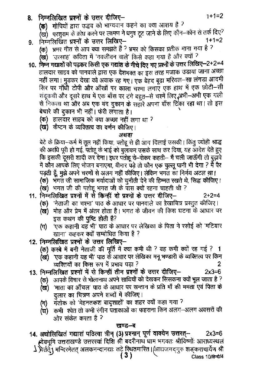| Study Material Here | UK Board Previous Year Question Paper of Class 10 Hindi |