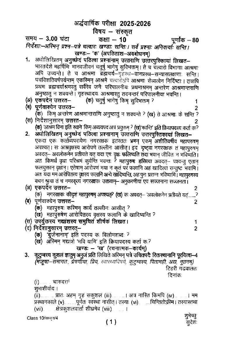 UK Board Class 10 Sanskrit Half Yearly Exam Question Paper 2026 PDF
