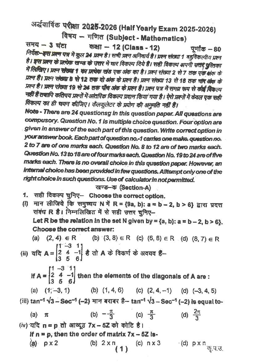 Uttarakhand Board Class 12 Mathematics Half-Yearly Question Paper 2026