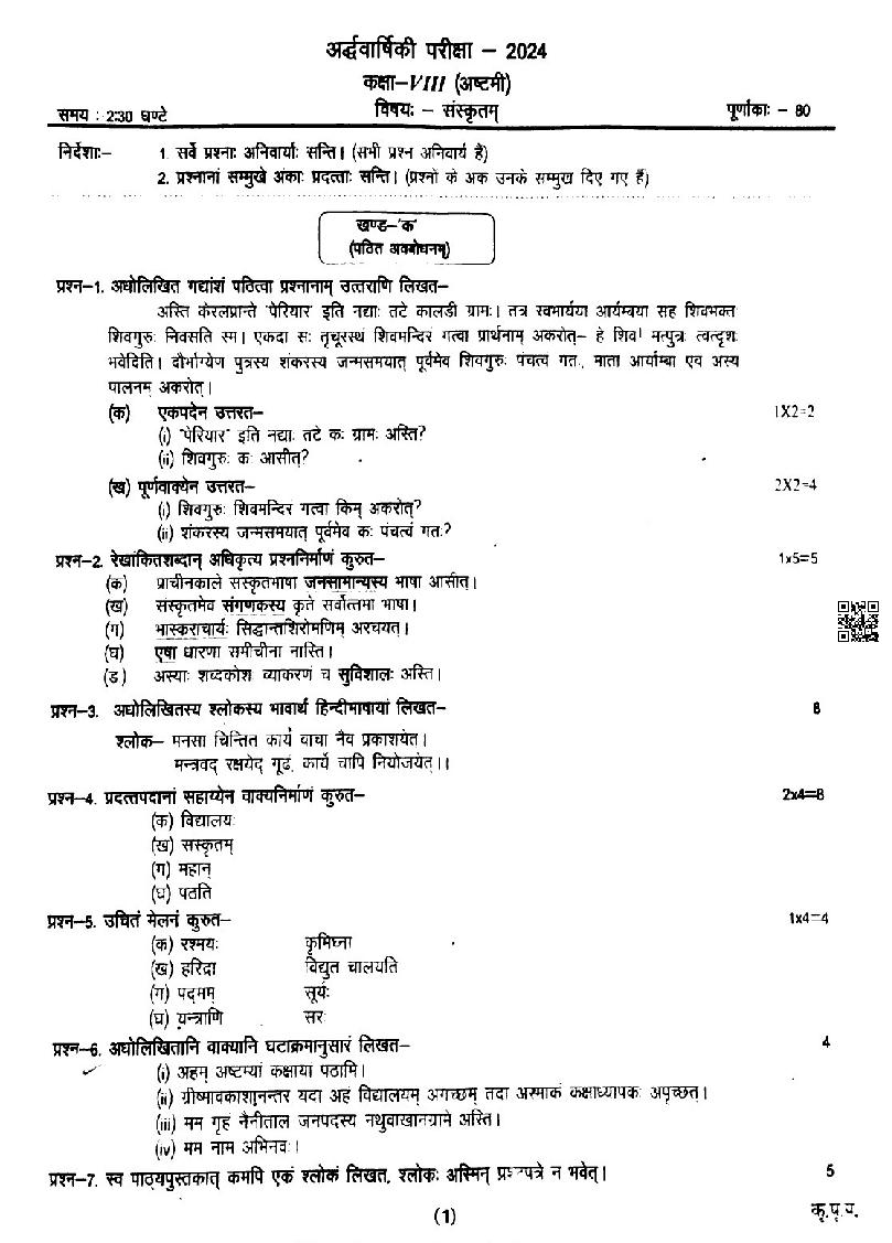 UK Board Class 8 Sanskrit half yearly Question Paper 2024 PDF – Click Here to Download Question Paper PDF