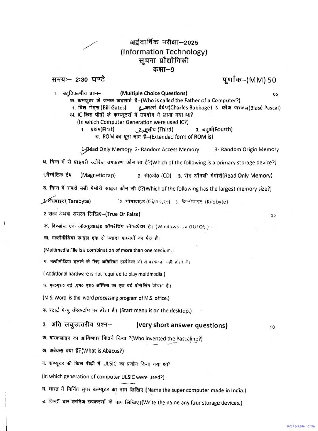 The UK Board Previous Year Question Paper for class 9th Information Technology half yearly examination is as follows.