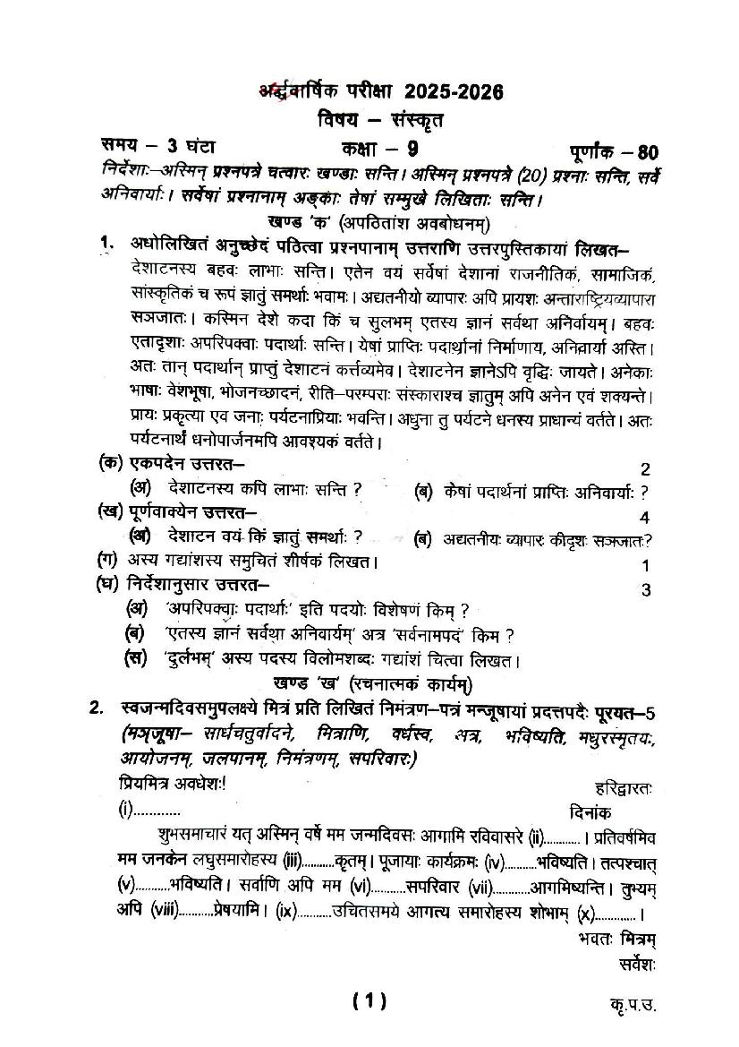 Uttarakhand Board Class 9 Sanskrit Half-Yearly Question Paper 2026