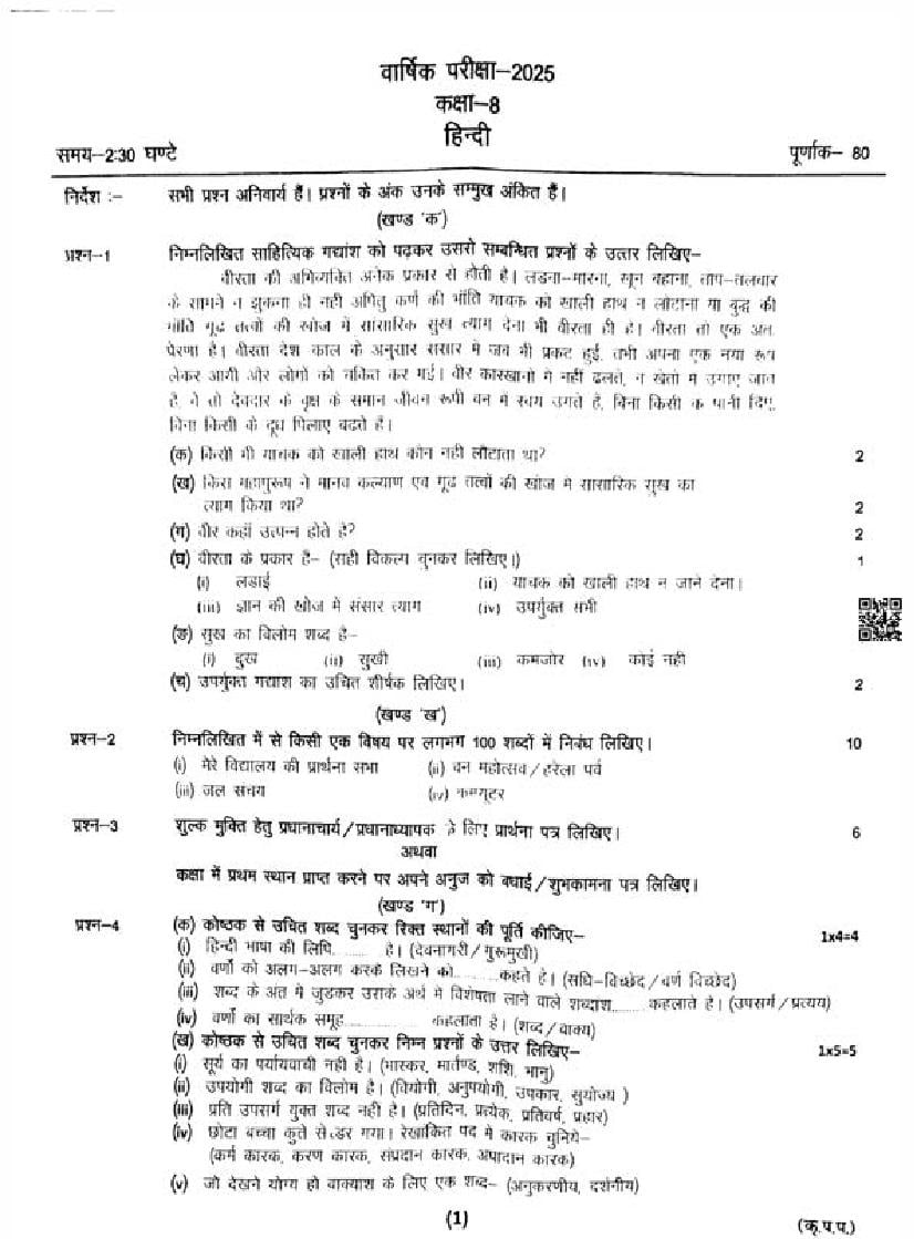 Uttarakhand Board Class 8 Question Paper 2025 Hindi View Download