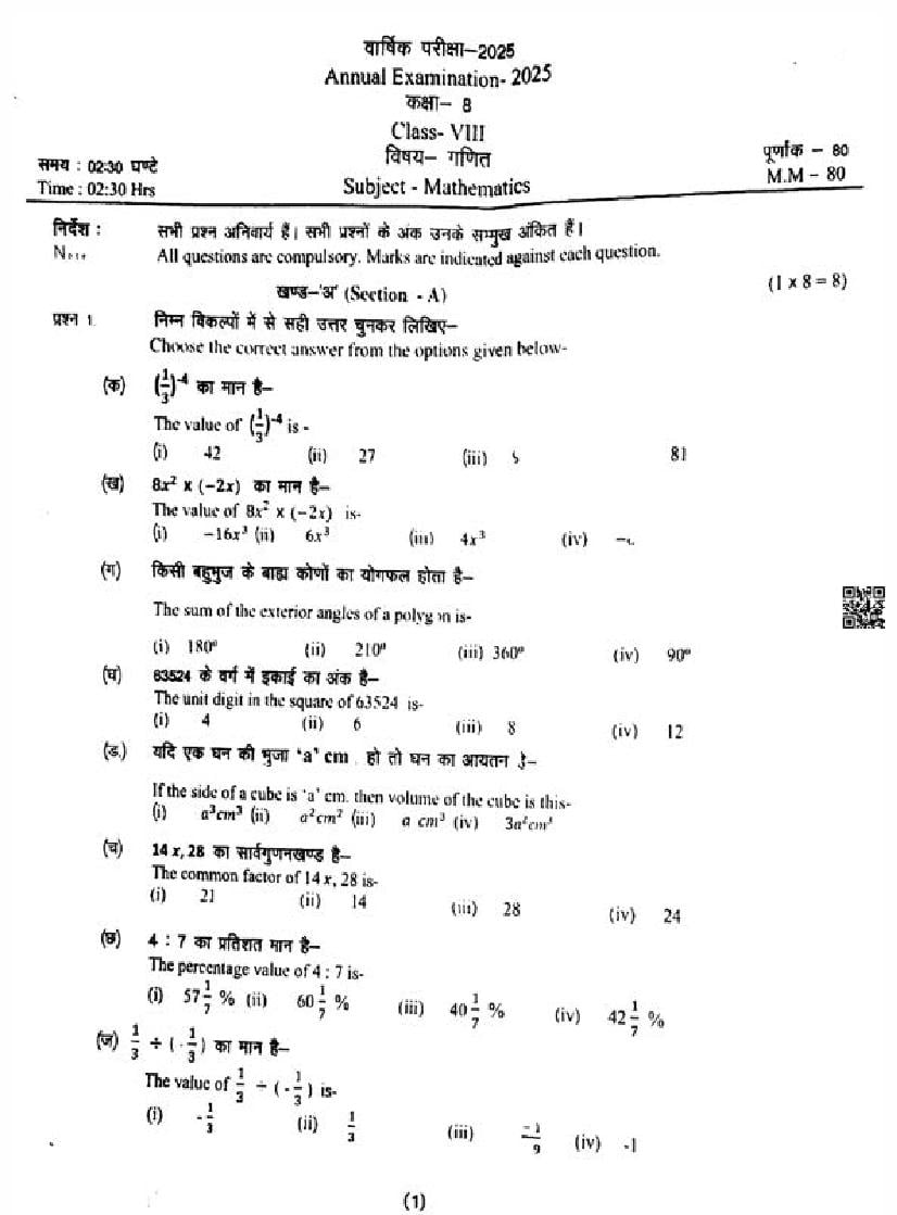Uttarakhand Board Class 8 Question Paper 2025 Maths View Download