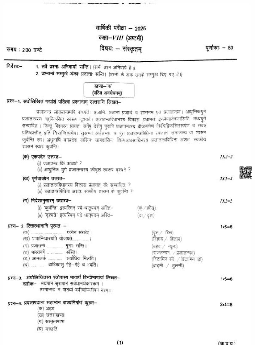 Uttarakhand Board Class 8 Question Paper 2025 Sanskrit View Download
